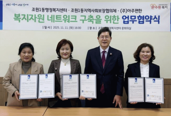 [NWS¹æ¼Û=Çѽ¸ñ ±âÀÚ]¼ö¿ø½Ã Àå¾È±¸ Á¶¿ø1µ¿ Áö¿ª»çȸº¸ÀåÇùÀÇü´Â Áö³­ 11ÀÏ, °ü³» ¢ß¾ÆÁÖÆíÇѰú ÇÔ²² º¹ÁöÀÚ¿ø ³×Æ®¿öÅ© ±¸ÃàÀ» À§ÇÑ ¾÷¹«Çù¾à½ÄÀ» ÃßÁøÇß´Ù. À̹ø Çù¾àÀ» ÅëÇØ Á¶¿ø1µ¿ ÇàÁ¤º¹Áö¼¾ÅÍ ¹× Áö¿ª»çȸº¸ÀåÇùÀÇü´Â °ü³» Ã롦