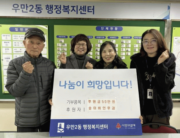 [NWS¹æ¼Û=Çѽ¸ñ ±âÀÚ]Áö³­ 9ÀÏ, ¼ÛÀ̺ñÀÎÈİú´Â ¼ö¿ø½Ã ÆÈ´Þ±¸ ¿ì¸¸2µ¿(µ¿Àå ÃÖ¿µ¹®)¿¡ °ü³» Ãë¾à°èÃþÀ» À§ÇÑ ÈÄ¿ø±Ý 50¸¸¿øÀ» ±âºÎÇß´Ù. ¼ÛÀ̺ñÀÎÈİú´Â Áö¿ª ÁֹεéÀÇ °Ç°­ ÁõÁøÀ» À§ÇØ ´Ù¾çÇÑ ÀÇ·á ºÀ»ç¿Í »ó´ãÀ» Á¦°øÇØ ¿ÔÀ¸¸ç, Á¤¡¦
