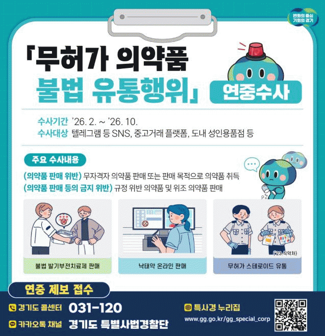 [»çȸ] °æ±âµµ Ư»ç°æ, ½ºÅ×·ÎÀ̵塤ÀÓ½ÅÁßÀý¾à µî ¹«Çã°¡ ÀǾàǰ ºÒ¹ýÀ¯Åë ¿¬Áß ÁýÁß¼ö»ç |2026. 02.23