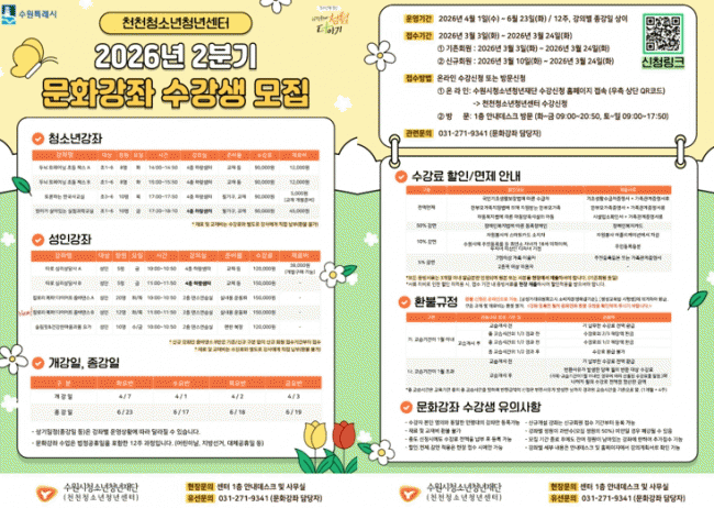 [NWS¹æ¼Û=Çѽ¸ñ ±âÀÚ]¼ö¿ø½Ãû¼Ò³âû³âÀç´Ü õõû¼Ò³âû³â¼¾ÅÍ´Â Áö¿ª û¼Ò³â ¹× ¼ºÀÎÀ» ´ë»óÀ¸·Î ÇÏ´Â 2ºÐ±â ¹®È­°­Á ¼ö°­»ýÀ» ¸ðÁýÇÑ´Ù°í ¹àÇû´Ù. À̹ø 2ºÐ±â °­Á´ ¼¼´ëº° Ư¼º°ú ¼ö¿ä¸¦ ¹Ý¿µÇÑ ÃÑ 9°³ÀÇ ´Ùä·Î¿î ÇÁ·Î±×·¥À¸·Î ¡¦